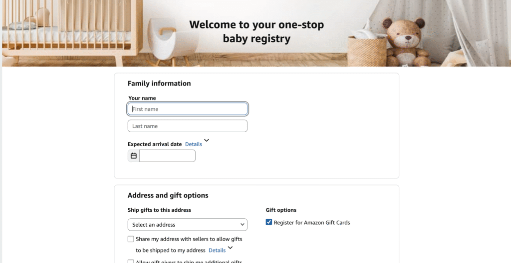 Head to the Baby Registry section on Amazon and click Create Baby Registry. Log into your account if you aren’t already signed in.