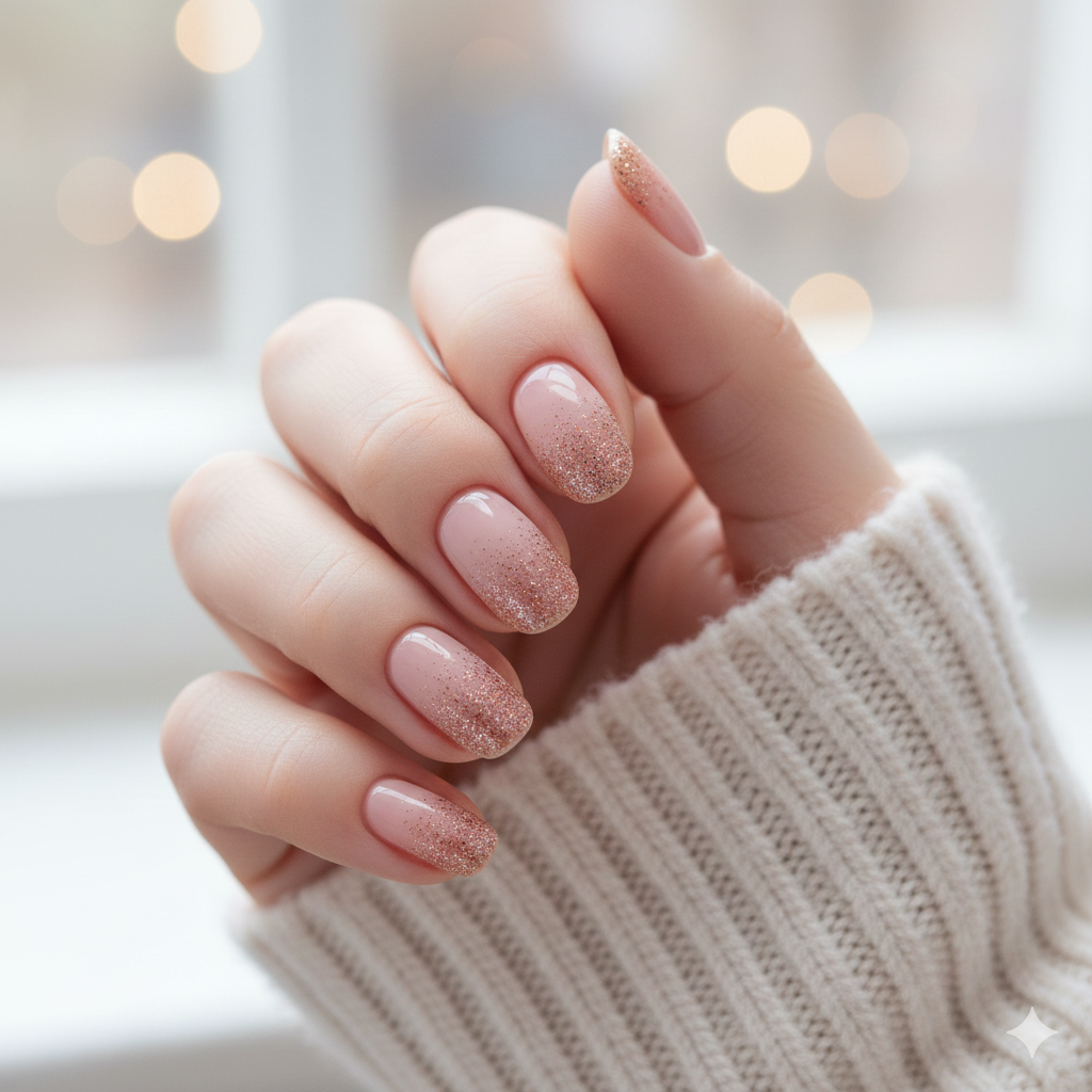 - Tools Needed: Base coat, a nude or light pink polish, and a fine glitter polish.