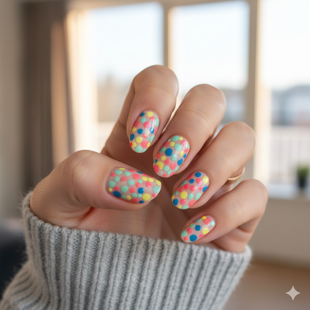 - Using a dotting tool (or the tip of a bobby pin/toothpick), randomly place small, irregular dots or short dashes of each color onto one or two accent nails. Don’t worry about perfect circles or spacing; the abstract nature is part of the charm.