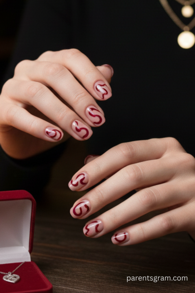 On a clear or nude base, use a thin brush (or a toothpick) to paint “S” shaped swirls using your dark red polish.