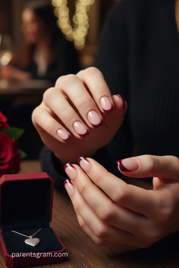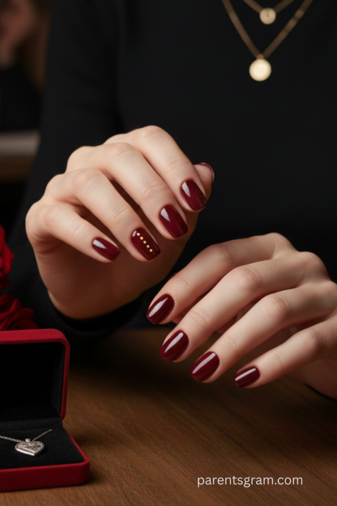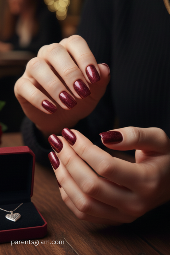 Choose a dark red polish that has a subtle metallic or shimmer finish. It catches the light beautifully during a candlelit dinner.