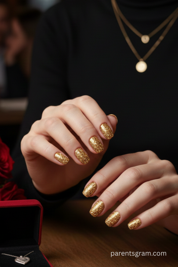 Start with a solid dark red base. While it’s still slightly tacky, dab a little gold or rose gold glitter polish onto the tips of your nails.