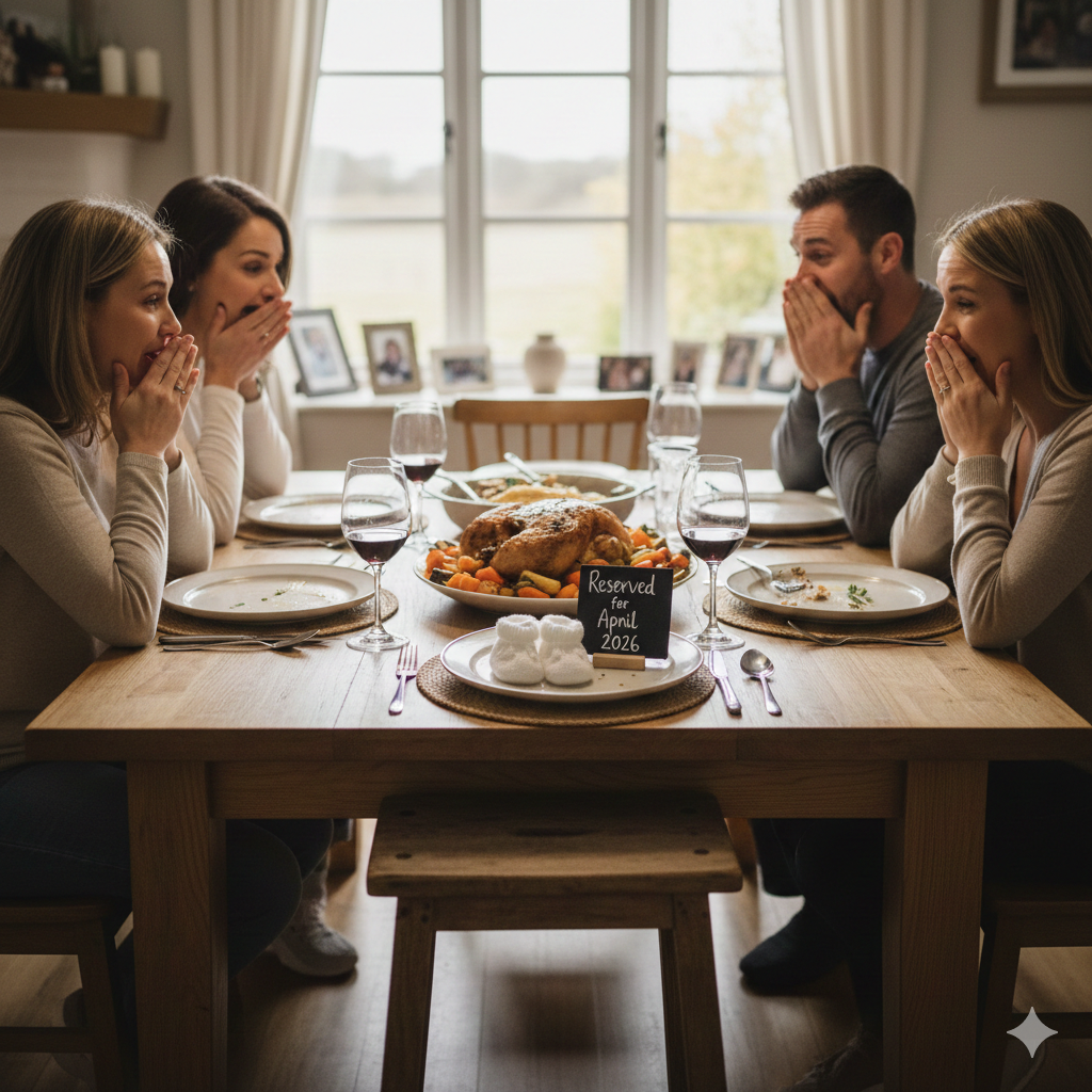 How to do it: Invite your closest family or friends over for a standard Sunday roast or a casual taco night. When setting the table, set an extra place—complete with a plate, cutlery, and a glass—but instead of a chair, place a pair of tiny baby booties or a small sign that says “Reserved for [Due Month] 2026.”